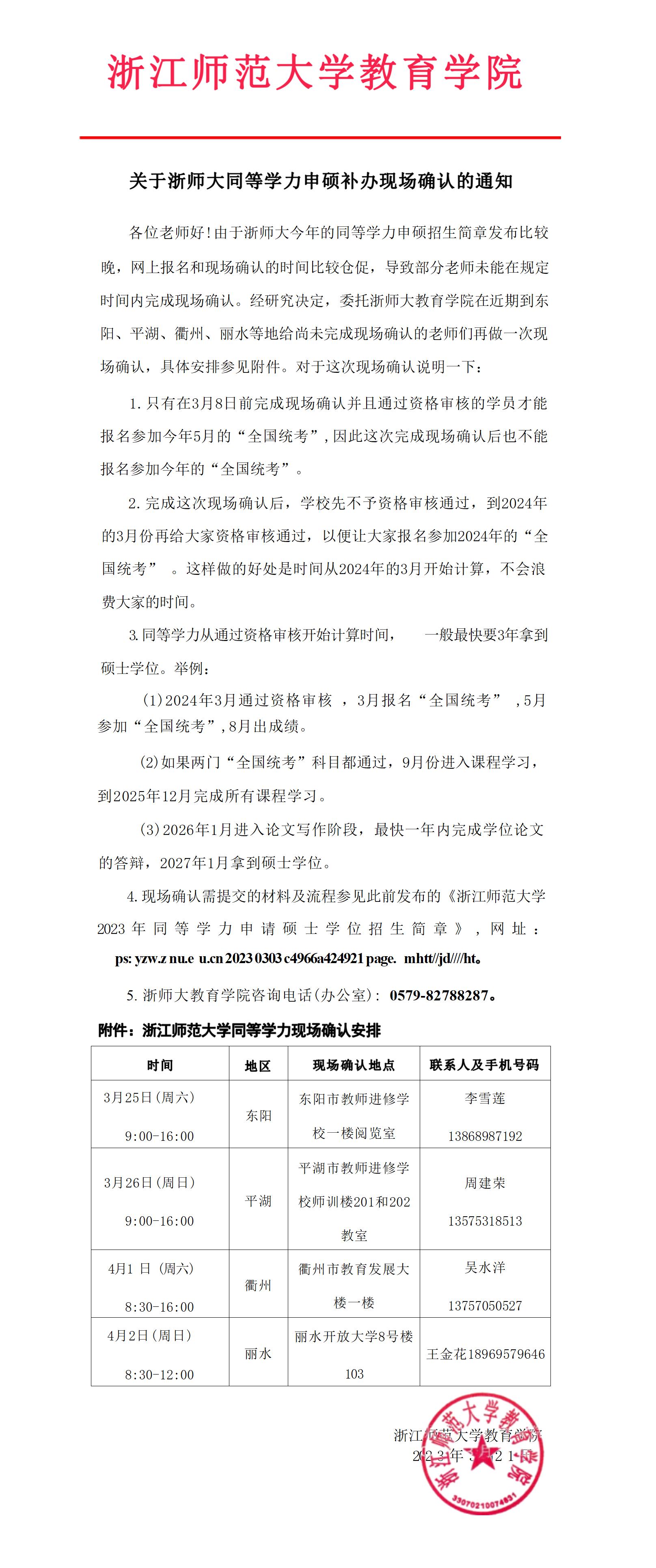 關(guān)于浙師大同等學(xué)力申碩補辦現(xiàn)場確認的通知