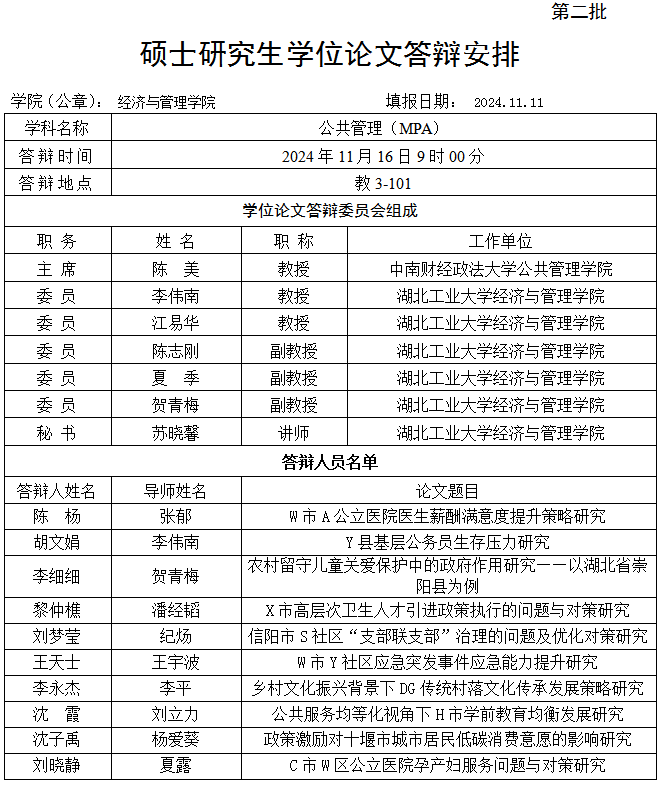 【湖工大MPA】碩士研究生學位論文答辯安排(公共管理MPA)