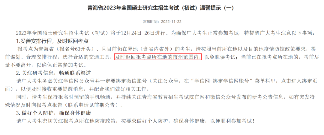 為確保您能順利參加2023年研考,請(qǐng)合理安排時(shí)間,盡早返回報(bào)考點(diǎn)所在地備考,同時(shí)密切關(guān)注報(bào)考點(diǎn)所在地防疫政策,按要求做好個(gè)人防護(hù)。