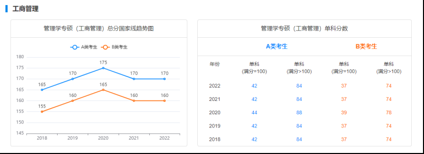 近五年工商管理專(zhuān)碩總分國(guó)家線趨勢(shì)圖