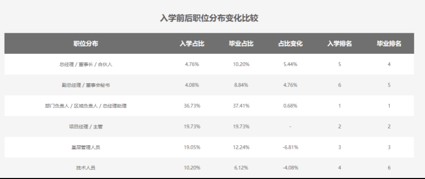 據(jù)根據(jù)部分招生單位公布的就業(yè)數(shù)據(jù)來(lái)看,畢業(yè)生可以到咨詢(xún)、金融、科技等MBA主流行業(yè)就業(yè),除此以外,IT\電信業(yè)、教育\文化\傳媒廣告業(yè)、房地產(chǎn)業(yè)等行業(yè)也是MBA的熱門(mén)選擇。不少畢業(yè)生成功轉(zhuǎn)行、晉升管理層,可見(jiàn),越來(lái)越多不同行業(yè)領(lǐng)域都需要MBA人才,畢業(yè)后的就業(yè)選擇多,MBA也更能適應(yīng)市場(chǎng)的需求。例如,從浙江大學(xué)MBA入學(xué)前后職位分布變化的比較中可以看出,MBA畢業(yè)后從事高層管理職位的占比增大,學(xué)業(yè)的完成也為未來(lái)的職業(yè)道路錦上添花。