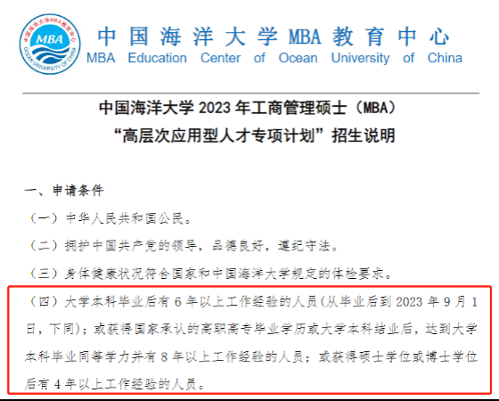 值得注意的是,部分招生單位對(duì)于學(xué)歷要求有不同的調(diào)整。如下圖所示,中國(guó)海洋大學(xué)2023年MBA“高層次應(yīng)用型人才專(zhuān)項(xiàng)計(jì)劃”有更長(zhǎng)的工作年限要求。