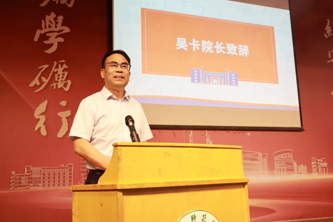 吳卡代表學(xué)院向2024級(jí)新生表示熱烈歡迎。他從學(xué)院雄厚的師資儲(chǔ)備、堅(jiān)實(shí)的學(xué)科平臺(tái)和成效顯著的人才培養(yǎng)三個(gè)維度為新生們介紹了學(xué)院充足的人才培養(yǎng)準(zhǔn)備,并向新生提出三點(diǎn)希望:一是修身立德。希望同學(xué)們?cè)谏硖帯皟蓚€(gè)大局”風(fēng)云激蕩的大時(shí)代背景之下,保持精神的獨(dú)立性,涵養(yǎng)高尚的道德情操,明辨是非、弘揚(yáng)正道。二是勤奮學(xué)習(xí)。希望同學(xué)們?cè)谇谟谒伎?,掌握各種知識(shí)的基礎(chǔ)上,激發(fā)自己的內(nèi)在潛能,全方面提升自己的品德素養(yǎng)、社會(huì)責(zé)任和實(shí)踐本領(lǐng)。三是強(qiáng)健身心。希望同學(xué)們積極適應(yīng)地域人文、集體生活、人際交往、社會(huì)環(huán)境的各種變化,學(xué)會(huì)正確對(duì)待成敗得失,以積極健康的身體和心理狀態(tài),理性思考、從容應(yīng)對(duì)大學(xué)生活。最后,他祝愿同學(xué)們將個(gè)人的成長融入師大夢(mèng)、中國夢(mèng),書寫下人生最美麗的青春篇章,成就“法”與“治”的夢(mèng)想。
