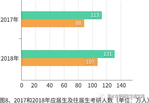 據(jù)教育部統(tǒng)計(jì),2017年共201萬(wàn)人報(bào)考,其中,應(yīng)屆考生113萬(wàn)人,往屆考生88萬(wàn)人;2018年共238萬(wàn)人報(bào)考,其中,應(yīng)屆考生131萬(wàn)人,往屆考生107萬(wàn)人。從數(shù)據(jù)可知,2017年,往屆生考研人數(shù)占全國(guó)報(bào)考人數(shù)的43.8%,2018年,往屆生考研人數(shù)占全國(guó)報(bào)考人數(shù)的45%,同比上升了1.2%。
